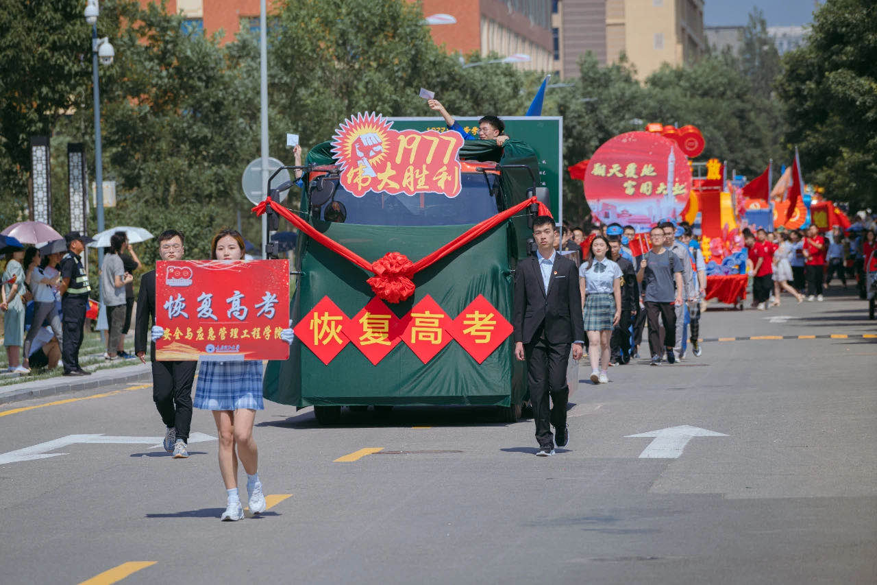 表演队伍由参加高考的工人农民和上山下乡知识青年组成。活动期间,同学们积极参与,热情高涨。经过观礼台,巡游方队挥动着国旗与报纸,高呼“不忘初心、牢记使命,砥砺前行、勇攀高峰”,展现出安全学子昂扬的精神风貌。