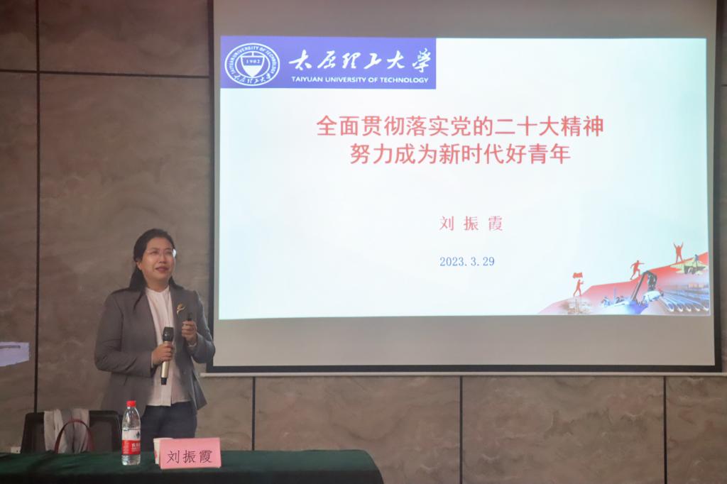 为深入学习宣传贯彻党的二十大精神,全面贯彻习近平新时代中国特色社会主义思想,全面落实立德树人根本任务,进一步统一思想、凝心聚力, 3月29日下午,安全学院在明向校区安全楼一层报告厅举办党的二十大精神宣讲暨形势政策报告会,特邀马克思主义学院院长、教育部思想政治理论课教学指导委员会分教支委委员、山西省高校思想政治理论课“习近平新时代中国特色社会主义思想概论课”教学指导组组长刘振霞教授作宣讲报告,院党委理论学习中心组成员、全体党支部书记及委员、学院专兼职辅导员(班主任)、研究生及本科生团学骨干代表、学生党员代表和入党积极分子代表等参加会议,院党委书记闫怡红主持会议。